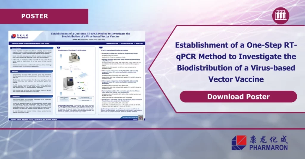 This study describes the method validation of a one-step RT-qPCR to investigate the biodistribution of RNA virus vaccine against RSV in Sprague-Dawley rats after nasal administration. Tissues from key organ systems and blood were collected for analysis. RNA extraction was performed using the Kingfisher Apex, followed by RT-qPCR analysis on the QuantStudio system. Method qualification confirmed robust accuracy, precision, and stability.