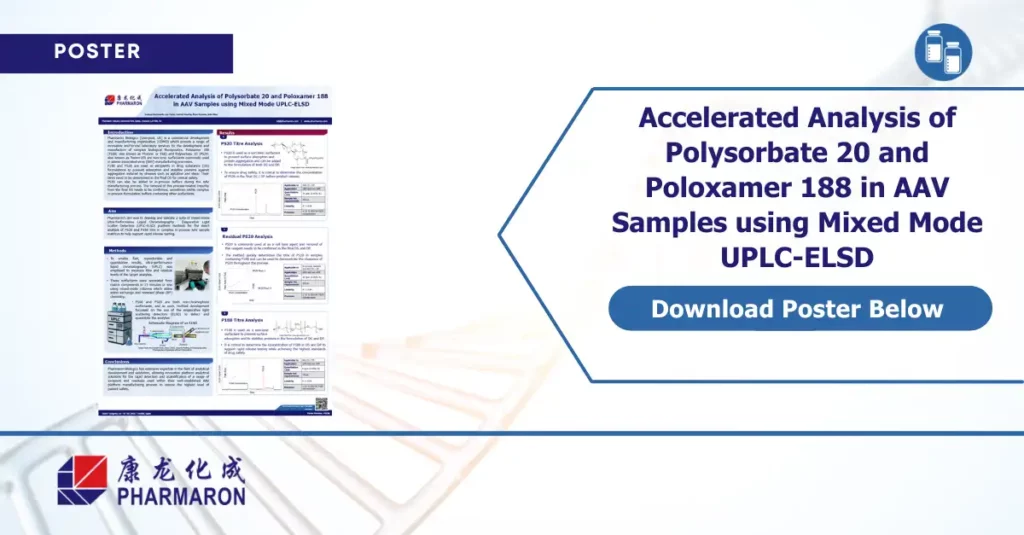 Using mixed mode UPLC-ELSD, Pharmaron enables rapid quantitation of these surfactants to meet preclinical safety thresholds, especially within interventional research involving AAV-based therapies.