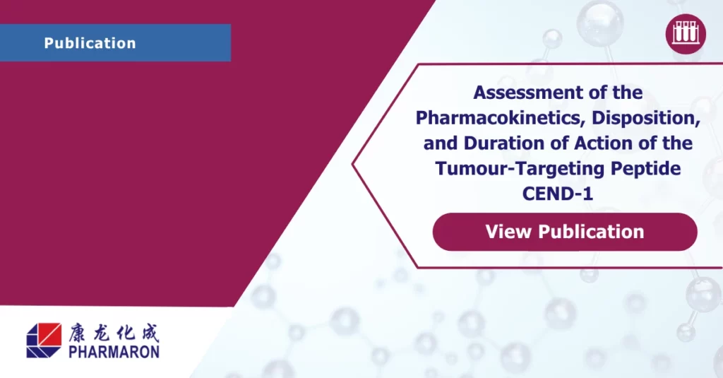 CEND-1 peptide (iRGD) is a bifunctional cyclic peptide that enhances delivery and efficacy of anti-cancer agents by modulating the tumour microenvironment. This study evaluated its pharmacokinetics (PK), tissue distribution, tumour selectivity, and duration of action in animals and humans. Following intravenous administration, CEND-1 showed rapid plasma clearance but sustained tumour retention. Radiolabelled CEND-1 localized to tumours despite rapid systemic and tissue clearance. In hepatocellular carcinoma models, tumour penetration effects lasted at least 24 hours. These findings suggest CEND-1 has a favourable PK profile and prolonged tumour-targeting capability, supporting its potential to improve anti-cancer drug delivery.