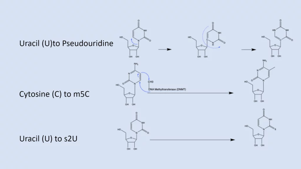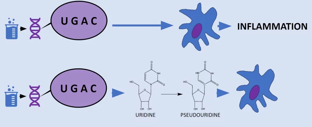 Inspired by the established knowledge surrounding DNA, the pair investigated the impact of post-translational processing modifications in RNA. Mandatory modifications include end capping and polyadenylation, but it is common for mRNA to be additionally chemically modified at internal points. Among these modifications are acetylation, sulfonation, methylation, lipidation, amidation, and pseudouridylation—the key modification that facilitated the COVID-19 vaccine. Karikó and Weiss initially tested five total chemical isosteres, including three of the four major building blocks of mRNA— A, U, G, and C. The original five were m5C, m6A, m5u, s2U, and pseudouridine (m5C refers to methylation on the fifth carbon of cytosine, s2U to sulfonation of the second carbon of uracil).